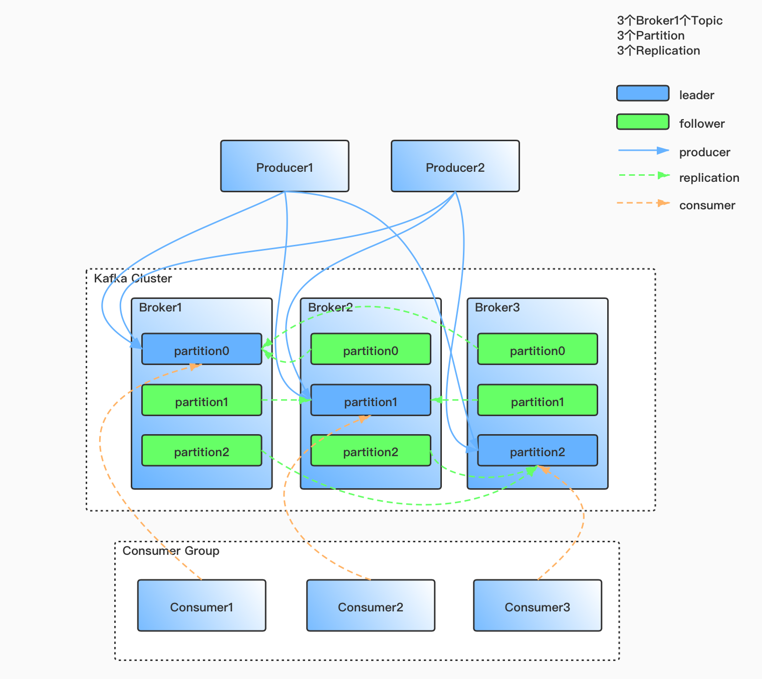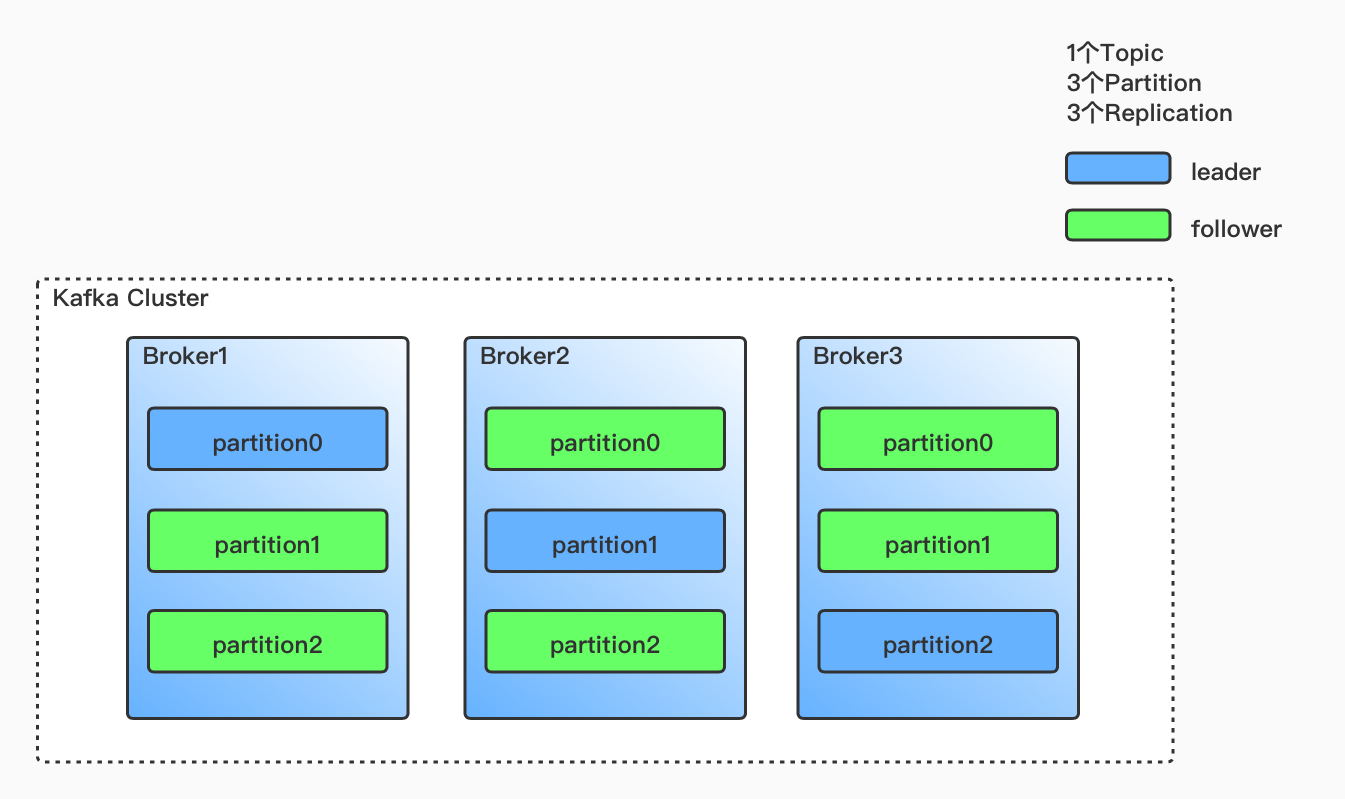创建Topic时可以指定副本数(至少一个副本)。当创建一个Topic,指定3个分区和3个副本。这样每个分区都有3个副本,Kafka根据一定策略,选出每个分区里的leader和follower,然后尽力确保每个分区的leader落在不同的Broker上。当有Broker宕机的时候,就会触发分区副本选举机制,选举出新的leader。如下图所示: