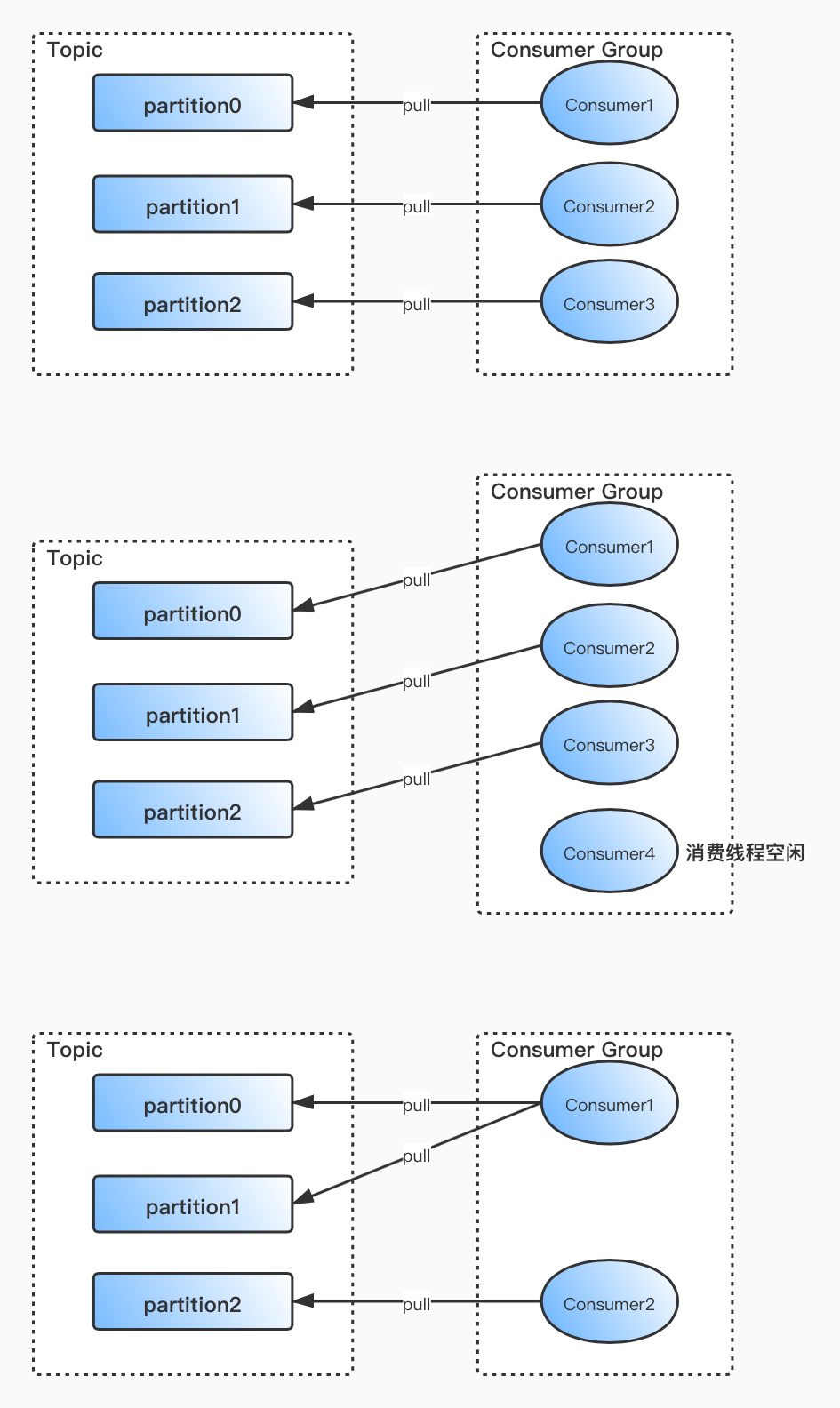 在Kafka中,1个Partition只能被1个消费线程消费。消费线程主动pull数据,而非Kafka Server主动push数据,这样消费者可以根据自己的消费能力消费数据。如果有消息堆积,也方便开发人员对消费者及时管理。