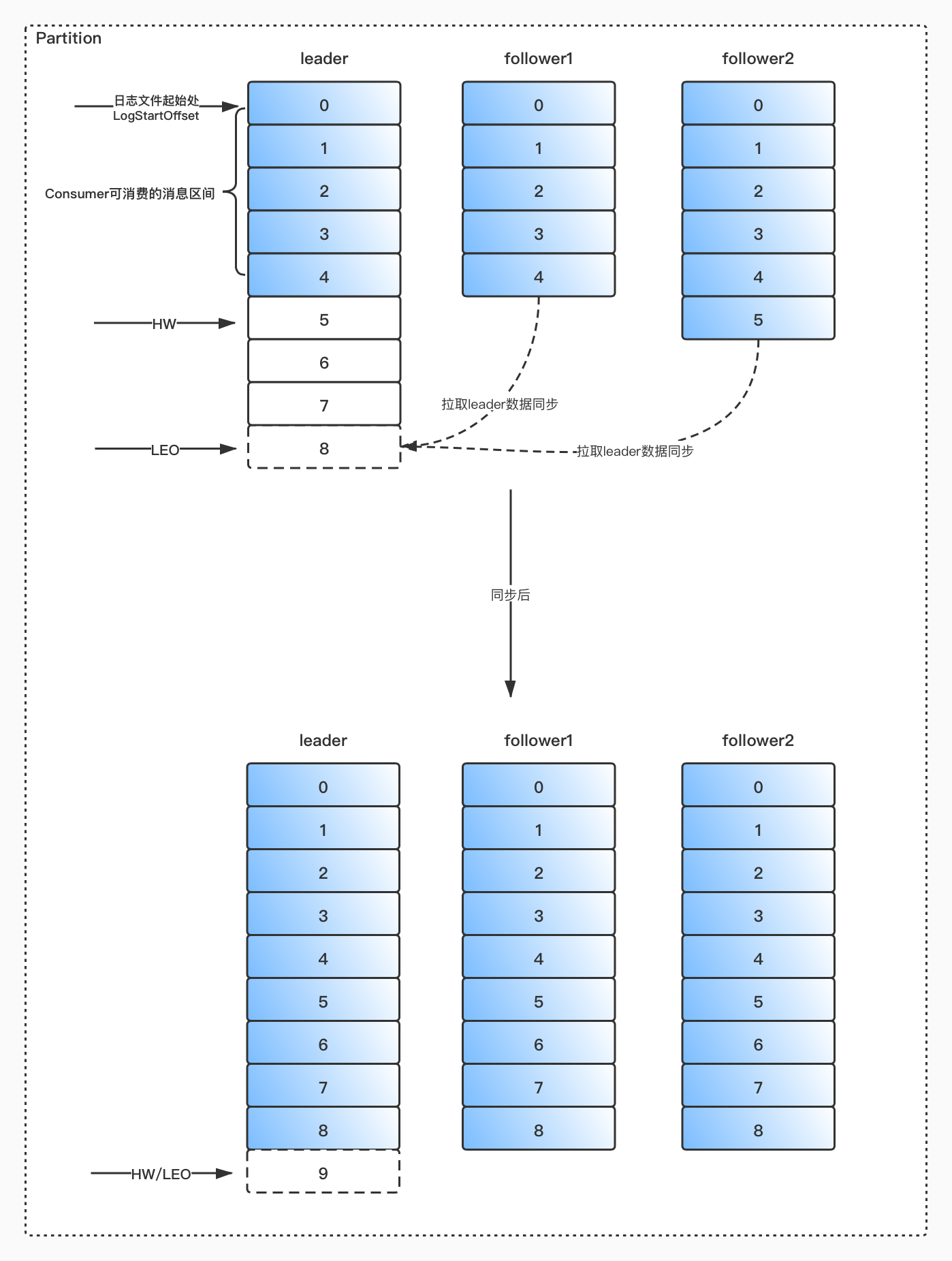 follower副本都复制完,这条消息才会被确认为已成功提交,这种复制方式极大的影响了性能。而异步复制的方式下,follower副本异步的从leader副本中复制数据,数据只要被leader副本写入就被认为已经提交成功。在这种情况下,如果follower副本都落后leader副本,突然leader副本宕机,则会造成数据丢失。