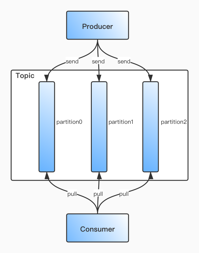 顾名思义,主题。Kafka存储消息的逻辑概念,可以简单理解为上面所说的queue。生产者负责向Topic里send消息,消费者负责从Topic里pull消息然后处理。
